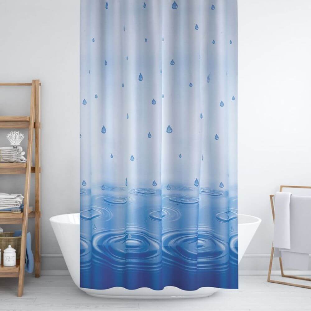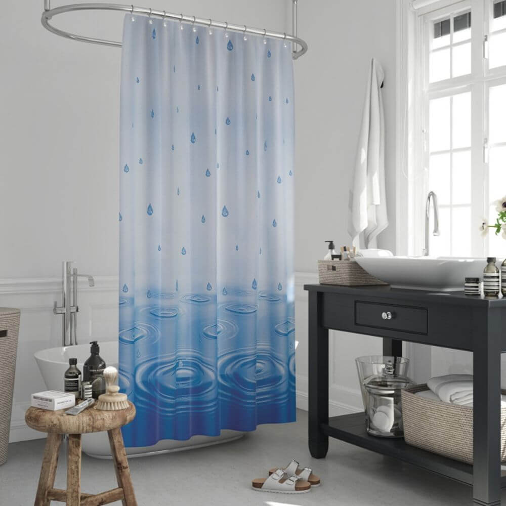 Priresa Zavesa za tuš DROP 180x200 cm | Vodoodporna tekstilna kopalniška zavesa s potiskom + 12 plastičnih obročev