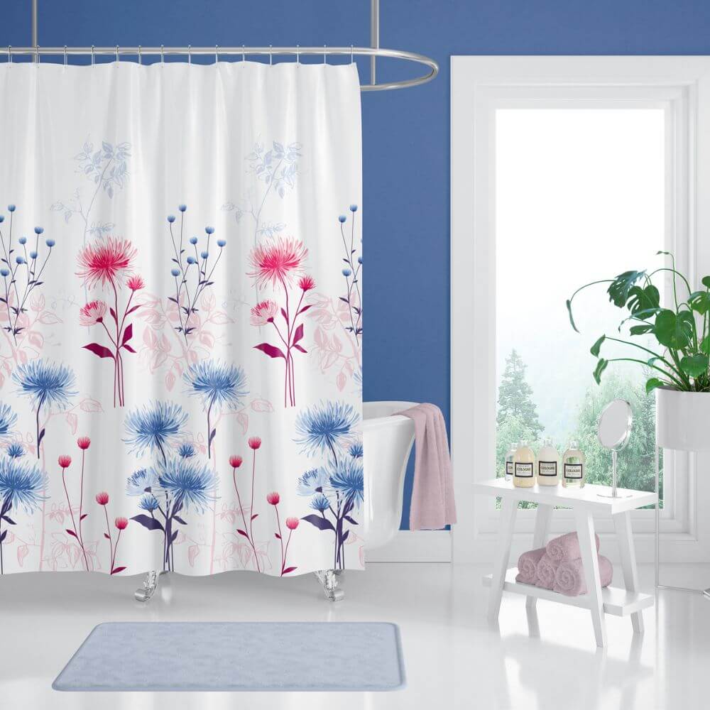 Zavesa za tuš JASIONE 180x200 cm | Vodoodporna tekstilna kopalniška zavesa s potiskom + 12 plastičnih obročev